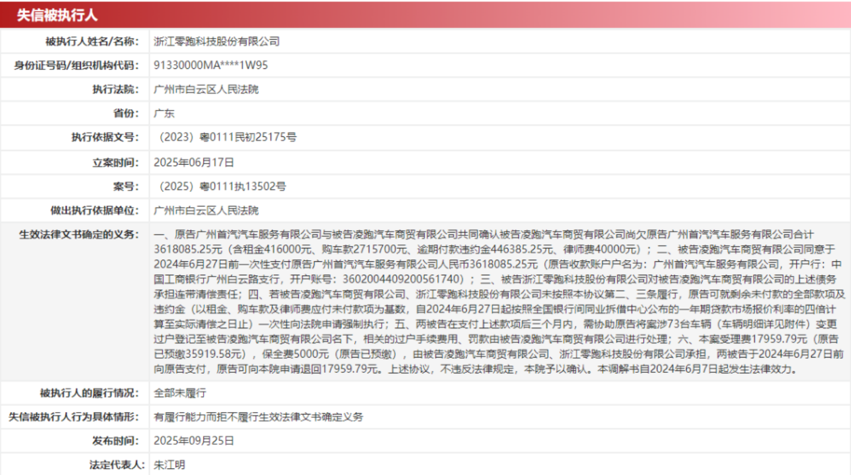 然而也就在同一天,广州市白云区人民法院将浙江零跑科技股份有限公司及其全资子公司凌跑汽车商贸有限公司列为失信被执行人。根据中国执行信息公开网显示,该案件案号为(2025)粤0111执13502号。
