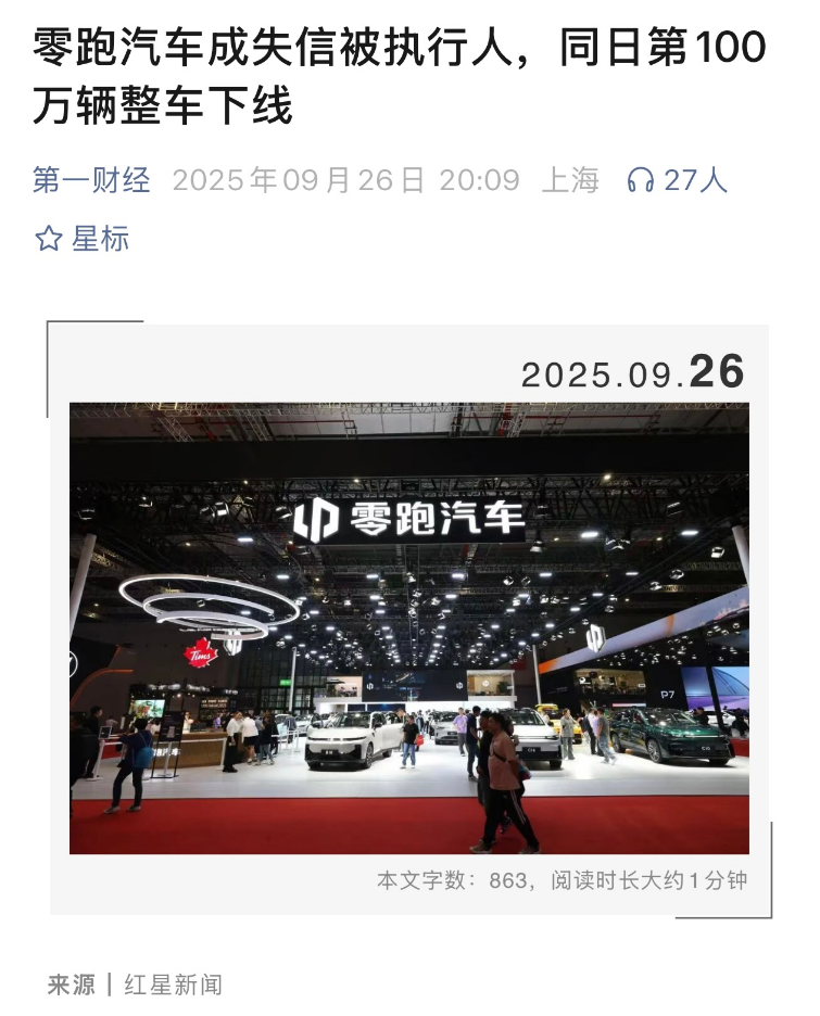 应该说,这多少有些让人想不到,也颇为让人诧异。零跑汽车在产量突破百万大关的高光时刻,不得不面对一起被列为“失信被执行人”的事件。