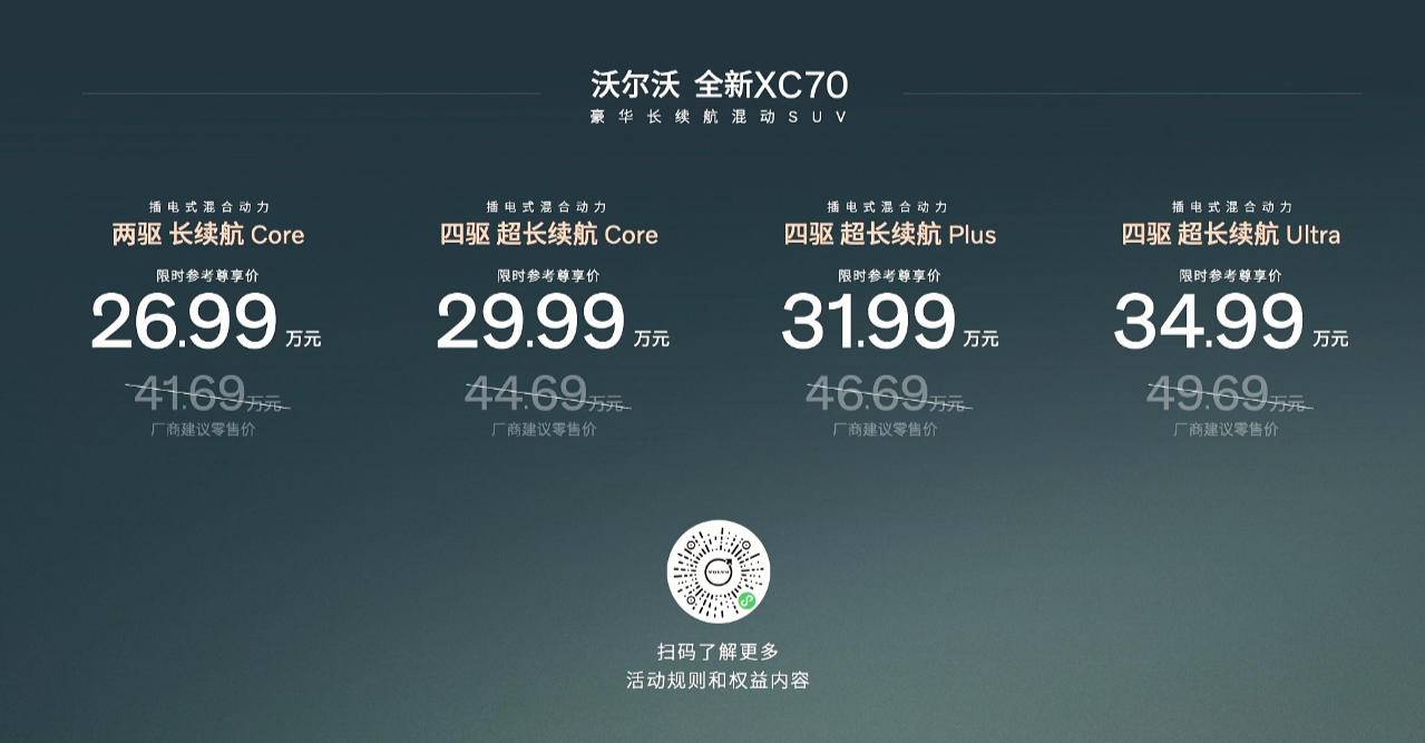 价格与配置的精准配比,是全新XC70引爆订单的核心密码。此次推出的4款车型覆盖多元需求:26.99万元的两驱长续航Core版满足日常通勤;顶配四驱超长续航Ultra版以34.99万元提供豪华满配,叠加置换补贴、金融贴息等价值超6万元的限时权益,性价比优势显著。一位现场订车的先生坦言:“这个价格能买到沃尔沃的安全技术和超混动力,完全超出预期。”