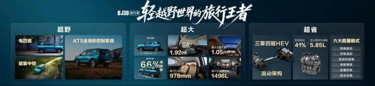 即便是轻越野旅行SUV,也需要足够专业的越野能力。BJ30旅行家要做越野能力最强的轻越野旅行SUV,搭载超级混动系统,拥有同级最大的301kW综合功率和同级最大的685N·m综合扭矩;搭载电四驱系统,响应速度仅需0.03秒,是机械四驱的3倍以上;搭载极速模式,零百加速仅需6.59秒;配备“能量中锁”和“四轮电子限滑”功能,能自动识别打滑车轮并将动力瞬间转移至有附着力的车轮,实现轻松脱困;拥有ATS全地形控制系统,提供雪地、沙地、泥地、涉水等7种驾驶模式,应对旅行之中的复杂路况。BJ30旅行家通过更高维度的技术标准来打破轻越野市场。可以说,这是对行业现有产品的“降维打击”。