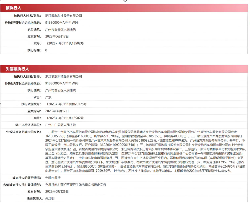 日前,零跑汽车因一笔361万元的欠款被列为失信被执行人。根据法院公开消息,这起纠纷的核心是零跑汽车全资子公司凌跑汽车商贸有限公司与广州首汽汽车服务有限公司(首汽租车旗下公司)的买卖合同纠纷。凌跑商贸确认欠款361.81万元(包括租金、购车款、违约金等),并曾同意于2024年6月27日前支付,零跑汽车作为母公司承担连带清偿责任。