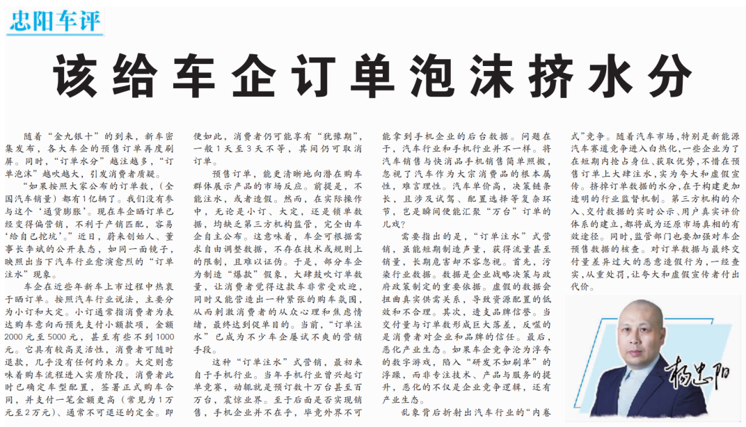 《经济日报》(党报)发布《该给车企订单泡沫挤水分》的社评文章,该文章犀利的指出各大车企“订单量注水”的情况;此类注水的营销手段最初来自手机行业,现在已经在汽车行业里发酵,但是汽车作为大宗商品,怎么可能瞬间汇聚“万台”订单呢?其为一些企业为了短期抢占身位、获取优势,在预售订单上大肆注水,实际为夸大和虚假宣传。