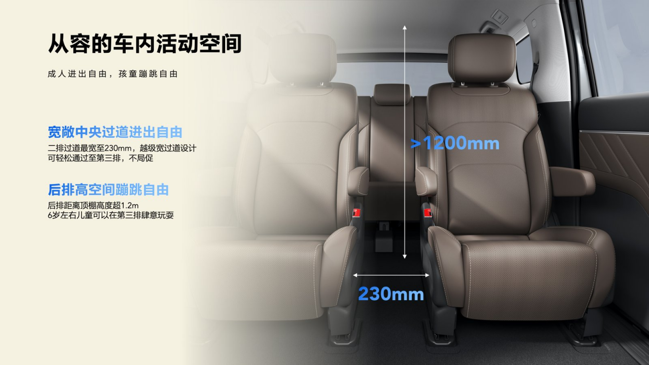 第二排是两个独立座椅,有腿托,二排过道的宽度达到了230mm,行业内一般达到180mm已经算得上优秀水平了,星光730进出第三排会更轻松。