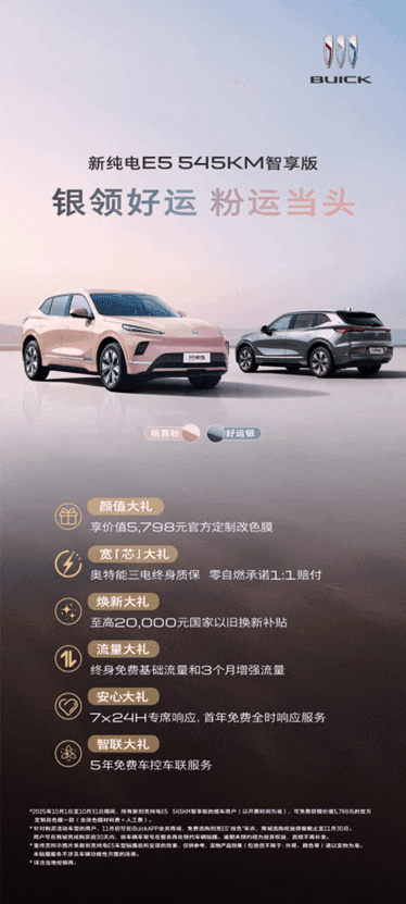 正值国庆、中秋双节来临,别克品牌推出购车重磅福利:购买别克纯电E5先享版,可在14.99万元一口价基础上,叠加至高“15 倍超级膨胀金”限时福利——1,000元定金抵扣15,000元,实际入手价低至13.59万元,让消费者用紧凑型纯电车的预算就能拥有中大型SUV越级体验;同时选购别克纯电E5智享版,可限时免费获赠售价5,798元的“好运银”或“桃喜粉”限量版炫色车衣,兼顾个性化审美与美好寓意*。此外,所有版本均享受奥特能三电系统终身质保、零自燃承诺1:1赔付、5年免费车控车联服务等安心保障,还可叠加至高2万元置换补贴。别克纯电E5真正从用户核心需求出发,以实打实的权益降低购车与用车成本,为消费者提供高品质纯电出行解决方案。