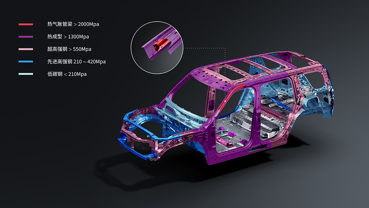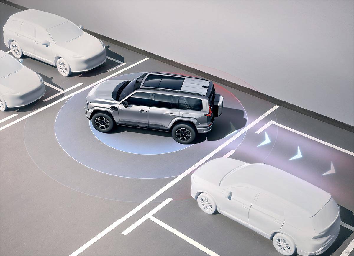 更别说它的越野硬实力了——“磐石底盘+极猛动力+智能全地形系统”,简直是为越野而生。双向20°的后轮转向,让这台5.1米长的车,最小转弯半径只有5.2米,在野外绕个石头、在城市窄路掉个头,比不少小车还灵活;150mm上下可调的空气悬架也超实用,下地库时把车身降到1850mm,过1.9米的限高杆毫无压力,遇到陡坡碎石堆,把底盘升高105mm,最小离地间隙能到333mm,爬坡过坎跟玩似的。