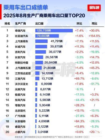 根据权威汽车媒体易车整理的出口数据:8月,比亚迪在生产厂商乘用车出口量排名中以79603辆的成绩位列第二,同比增长154.5%,增速排名第一。今年1-8月,比亚迪汽车累计出口量达601065辆,其中明星车型宋PLUS新能源销量达166699辆,摘得车型出口榜冠军,在国际市场的竞争力不断增加。