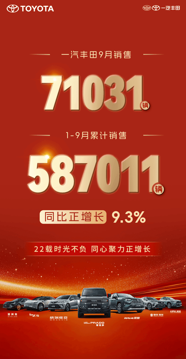 2025年10月1日,一汽丰田率先公布9月销售业绩;9月销售新车71031辆; 1-9月累计销售新车587011辆,同比增长9.3%,正增长定式持续延续。