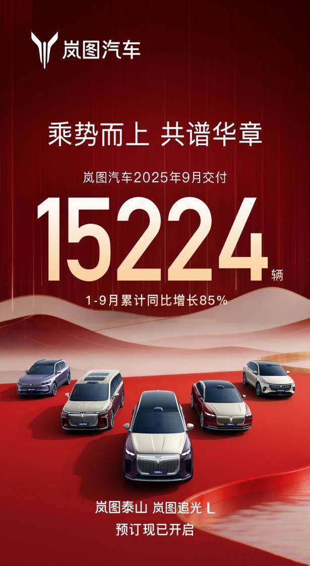 10月1日,岚图汽车公布9月交付数据。2025年9月,岚图汽车单月交付达15224辆,同比增长52%;2025年1-9月,岚图汽车累计交付达96992辆,同比增长85%,连续七个月销量过万并实现“八连涨”。作为央企东风汽车倾力打造的高端智慧新能源品牌,岚图汽车在新能源赛道上加速奔跑,9月接连推出“三旗舰”——2026款岚图梦想家、岚图追光L、岚图泰山,加速布局明星产品矩阵,市场反响热烈,并完成股份制改造,港股上市进程稳步推进,进一步释放品牌价值与发展潜力,持续打造央国企高端新能源第一品牌。