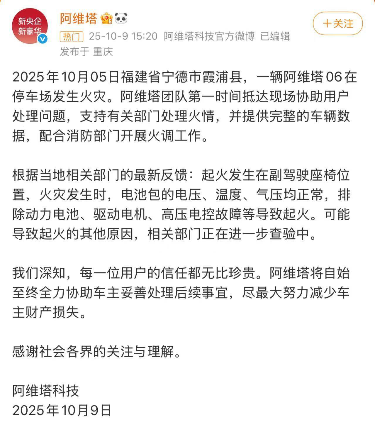 10月9日,阿维塔官方就10月5日一辆阿维塔06在福建某停车场起火,并引起周围7辆车着火事件进行了回应。
