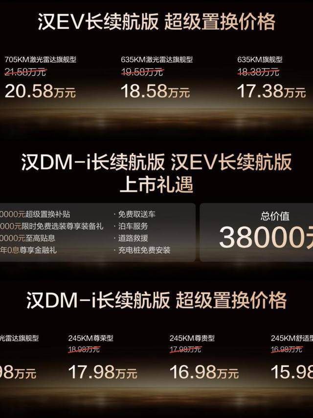 10月11日,比亚迪汉家族迎来重磅更新——汉长续航版正式上市。共推出汉DM-i长续航版4款车型,补贴后售价15.98万~18.98万元;汉EV长续航版共推出3款车型,补贴后售价17.38万~20.58万元(10月31日前完成购车可享1万元超级置换补贴)。同时,比亚迪提供包含置换补贴在内的至高价值3.8万元七大礼遇。